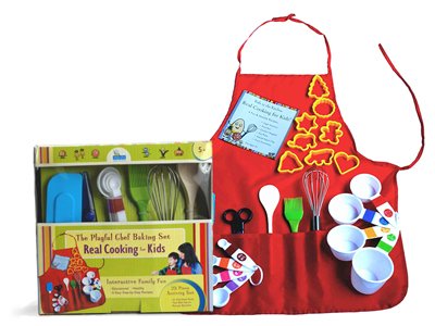 This fun and functional Playful Chef Kid's Baking Kit is the perfect gift for your favorite little baker ages 5+. The kit includes 13 kid-sized FDA grade tools, 8 plastic cookie cutters, 6 kid-friendly recipes and 1 RED Apron with tool belt. Apron is polyester for easy clean ups.